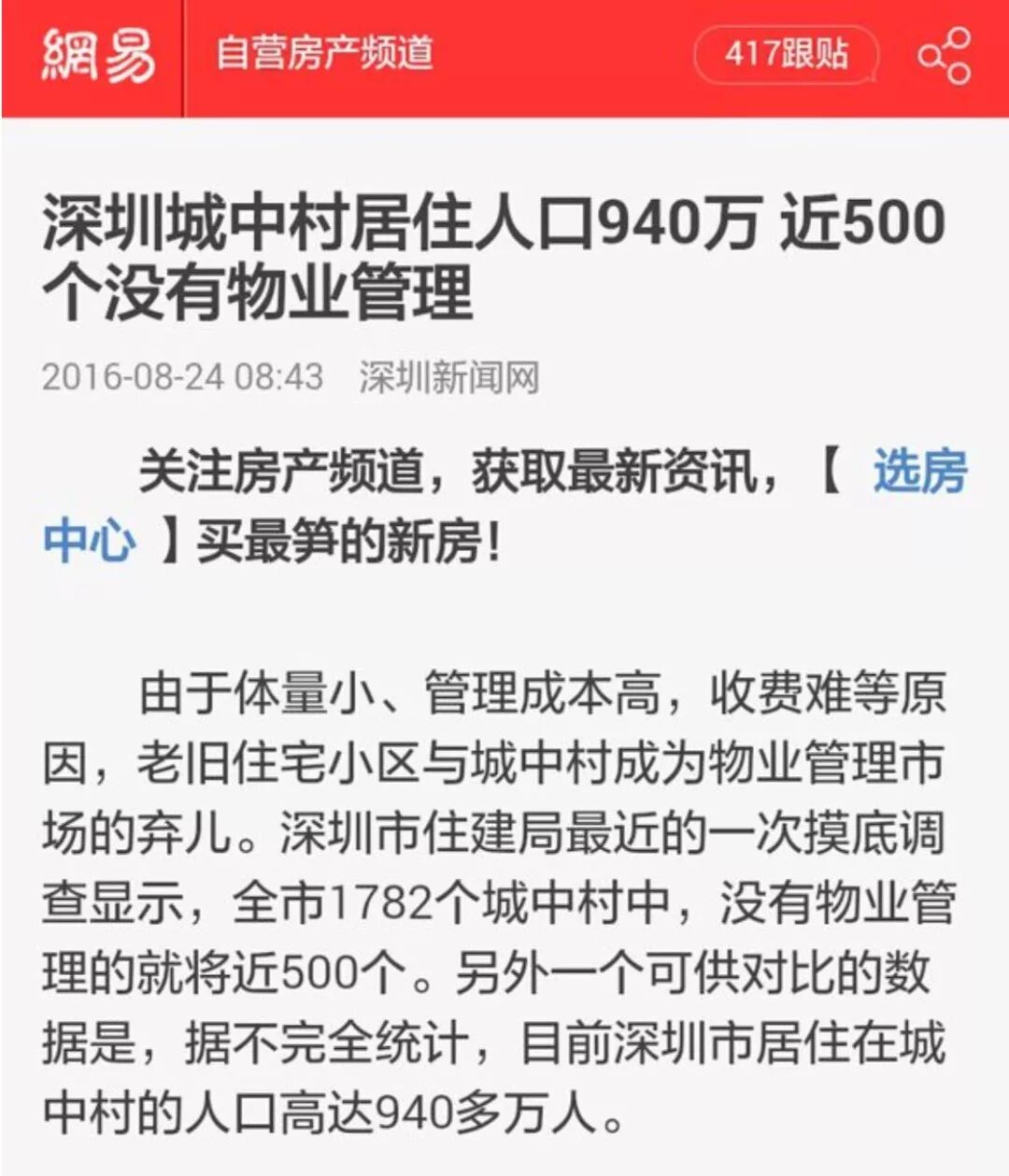 2016年时曾有不完全统计表示深圳市住在城中村的人口高达940多万人