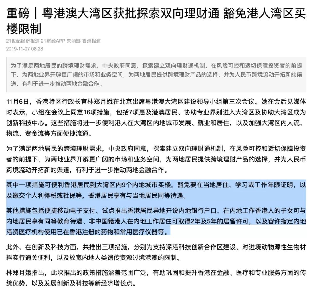 近期(2019年11月6日),港人还获得了粤港澳大湾区9个内地城市买房的资格,豁免在当地居住、学习、工作的年限证明,香港居民在这里完全享有与内地居民同等的待遇(在购房资格上,比内地人更加宽松)。