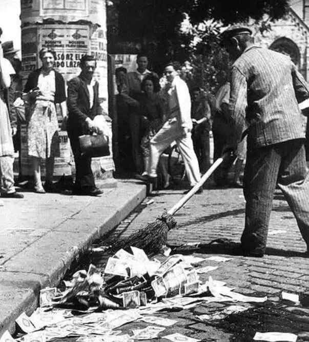 1923年5月起,德国央行疯狂开启印钞机,8个月内1枚金马克对应的纸币马克面值从10000马克飚到10万亿马克,贬值1000万倍。1918年可以买5000亿个鸡蛋的纸币,到1923年只能买1个鸡蛋。与一落千丈的币值相伴的是暴涨的失业率,1923年12月,魏玛失业率达到28.2%,每4个人里就至少有1个人失业。