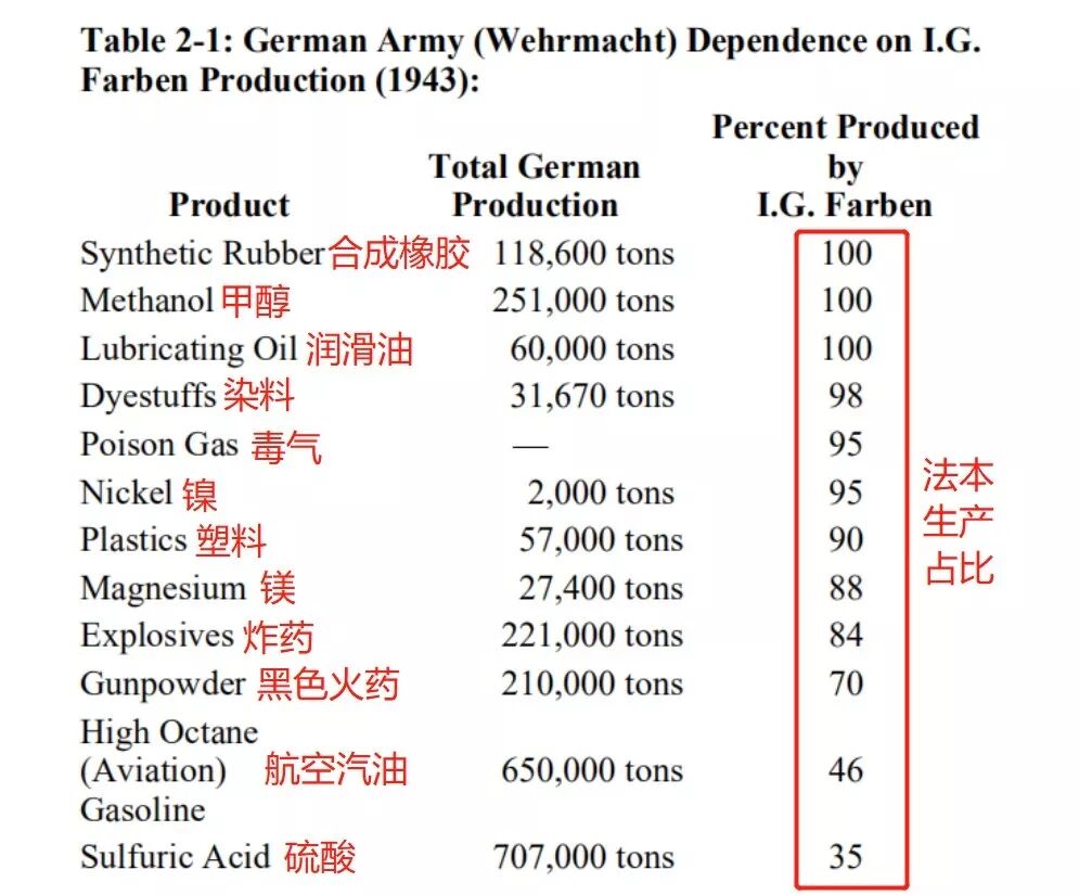 到1943年,法本垄断了100%的德国合成橡胶、甲醇和润滑油生产,以及98%的染料、95%的毒气和镍、90%的塑料、88%的镁、80%的炸药、70%的黑色火药、46%的航空汽油和35%的硫酸。可以说,没有法本疯狂的生产能力,希特勒的战争早在1943年就打不下去了。