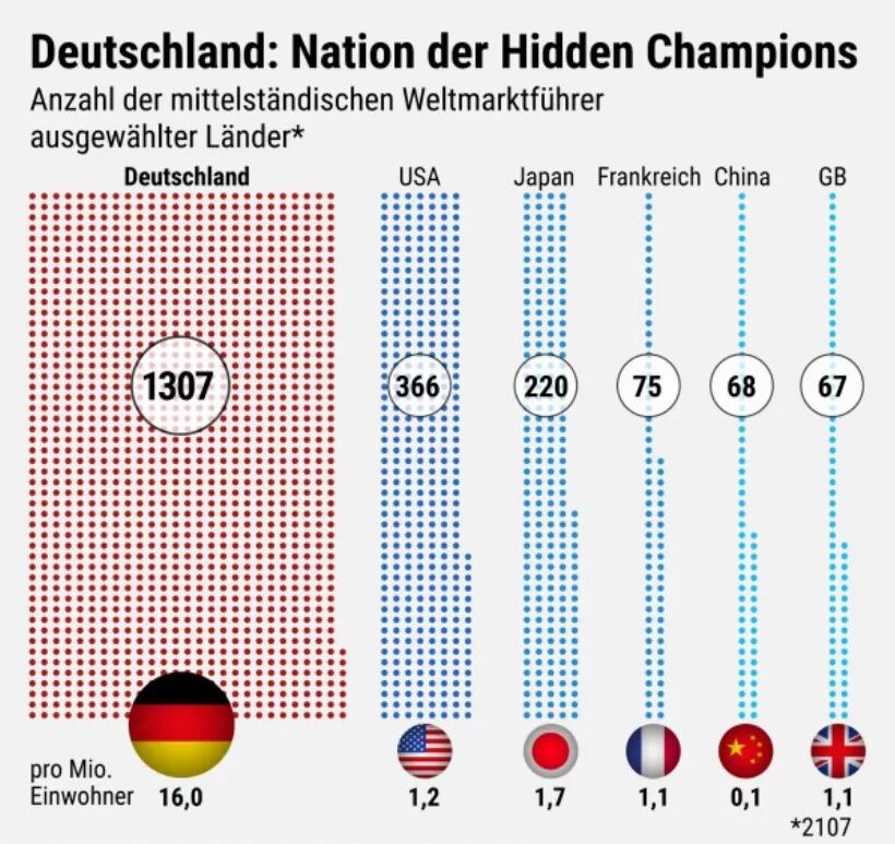 德国管理学家赫尔曼·西蒙曾调查了全世界近3000家“隐形冠军”,即那些规模较小、在细分领域市占率数一数二且不为公众所知的企业,发现1/3以上在德国(1307家),超过第二名美国(366家)与第三名日本(220家)及后几位的总和: