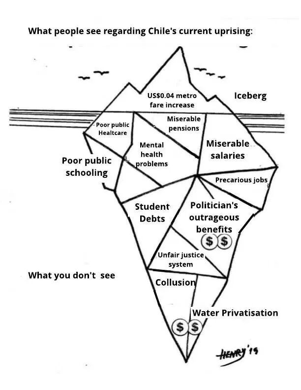 很多人不明白为啥地铁涨价,愤怒的群众把电力公司大楼烧了。激起大家愤怒的当然不止是地铁涨价,就像下面图里画的一样,这只是冰山一角,是压垮骆驼的最后一根稻草。所有民生产品都在涨价,一个普通智利人最简单的一日三餐要花掉月工资的40%,交通费需要14%,水电费需要10%,还不算其他开销。因为公共服务私有化涨价,智利不管是水电煤气还是医疗教育都非常贵。大学学费从几万到十几万一年,连医生律师这种中产家庭都负担不起,上个大学要欠银行一屁股债。被烧的这个电力公司以前是智利的国企,不怎么赚钱。因为民生产品嘛,国企价格涨太高肯定不合适。后面智利就把这公司卖给意大利人,变成了私有公司。私有化以后第一件事就是涨价。电费已经涨了很多次,到2020年1月份前还要上涨10% ,比2014年的价格涨了超40%。自由经济嘛,你嫌贵可以不用啊。资本家很讲道理的,没人强迫你用。涨太多吃瓜群众就怒了啊,一把火烧了电力大楼。都说这次智利骚乱是因为三毛钱涨价闹得,其实地铁之前也涨过很多次了,现在智利人乘地铁通勤月均要花掉八百块。私有化以后财团一直涨一直爽,这次大家终于怒了。