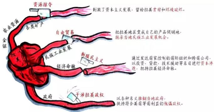 在多数国人的印象里,南美除了人民热情好客载歌载舞,就是遍地贫民窟,脏乱差加黑帮横行。前段时间不是有个典型的事嘛。因为抓捕墨西哥大毒枭古兹曼的儿子,贩毒团伙和墨西哥警察部队枪战。后面警方发现自己火力不足打不过毒贩,为避免更大的伤亡,警察和贩毒集团握手言和,放人回家了。最近更奇葩的是,由于地铁涨了3毛,导致了智利大规模的群众抗议和暴乱。安全没法保证,即将在圣地亚哥召开的Apec会议也被取消了。要知道智利在西方舆论的嘴里可是南美最富裕的准发达国家,是改革典范和自由主义标杆。为啥这样的国家地铁涨价三毛就能引发暴动?今天我们就从南美的资源魔咒开始,讲讲来龙去脉。西班牙和葡萄牙殖民者最早找到了拉美这块新大陆。从他们发现这块居住着原始印第安人的土地下居然埋藏着足以支撑起资本主义发展初期所需的全部金银开始,拉美的厄运就来了。金银被掠夺,土著被屠杀。靠着这些抢来的金银财富作为原始积累,欧洲大踏步进入资本主义时代。西方进入资本主义,最牛逼的进化是能在抢钱的同时提出一套逻辑严密的理论,为美化自己的行为提供道义和逻辑支持。英国人的自由贸易理论就是集大成者。自由贸易理论是亚当斯密创立的,这玩意对英国政治家影响很大。倒不是英国人真的信,而是他们发现这是个很好的统治工具。在生产率和产能碾压的情况下,如果能说服别国搞自由贸易,不但能把其他国家变成自己的产品倾销地,还能扼杀当地民族工业的发展机会,极大的加强英帝国在当地的经济霸权和统治地位。如果说不服,就寻求国家支持武力砸开大门,然后再搞自由贸易。比如鸦片战争就是这么来的。所以回顾经济史你会发现,虽然英国人向其他国家鼓吹自由贸易,自己搞的却是贸易保护那一套。之前我们在《穷则关税壁垒,达则自由贸易》里就讲过,不管英国人还是美国人,在崛起之初都是高贸易壁垒。比如英国人从来不在独立后的美国买东西,差点把美国扼杀在未成年。美国人也不让英国人随便卖东西进来,最低都是40%关税后面亚当斯密又发现分工可以促生产(所谓分工就是现在西方经济学家说的比较优势)。各种西方舆论又开始大力鼓吹发展中国家要服从国际分工,发挥比较优势,用初级产品交换发达国家工业品,实现双方共赢。这和自由贸易理论一样,是发达国家多年来尝试对第三世界洗脑的精髓。所以你看到玩的最溜的英国人让印度种鸦片,南美种甘蔗,北美种棉花。自己在本土搞工业,大赚工农业剪刀差。剪刀差这玩意好多同学不懂,简单说就是低价买原料,高价卖工业品。比如拿一件衬衫换一百吨甘蔗就是剪刀差。他们允许你生产一切初级原料,却不允许你造一根针。最后殖民地都被玩残了,没了宗主国就没法活。以前民国火柴为啥叫洋火,自己做不出来都是洋人造的呗。美国南北战争的起因也是这个。北方是工业党,南方种棉花。北方想发展民族工业,南方想跟着英国混做原料产地,因为南方只会种棉花,离了英国玩不转。为啥写拉美要花这么大篇幅讲自由贸易呢,因为他们就是被自由贸易和比较优势忽悠瘸的。而且是前面赶走豺狼,后面就迎来老虎。十九世纪初,拉美国家相继开始独立运动,赶走了凶残的西班牙和葡萄牙殖民者,迎来了狡猾的英国殖民者。英国人洗脑功力一流,多数拉美国家刚刚独立,就被英国的自由贸易理论洗脑了。相信这套理论的拉美国家门户大开,成为全世界最开放的经济体。一方面成为初级产品和资源的出口国,另一方面又是英国这些工业国的倾销市场。在国外廉价商品的冲击下,拉美民族工业基本没发展的可能性。英国人则成为这片土地的霸主,他们通过投资、贷款、贸易各种方式控制了拉美国家的经济命脉,把拉美大部分公用事业、能源、铁路、港口控制在手里。以前看到过一个图画的非常好,描绘了殖民者是怎么一步步把拉美吃干喝尽的,英国人包括后面的美国人也确实是这么做的。