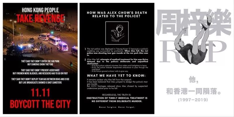 尽管这些说法没有任何证据,警方也对此做了澄清了,在周梓乐坠楼原因未明的情况下,示威者一口咬定就是警方害死了人,逼迫港科大校长去谴责警方,还口口声声说要为死者报仇。彭博社网站贴出的香港示威者制作的“文宣品”,写道:向香港警察复仇、11月11日抵制全城、为什么周梓乐之死与警方有关