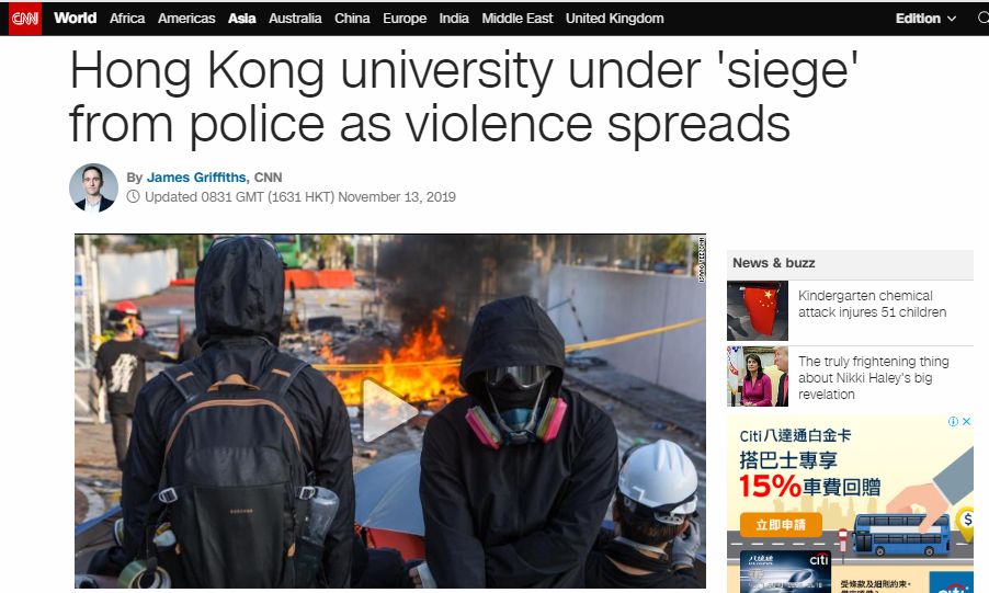 CNN是报道了暴力冲突,不过那屁股歪的,看看今天的标题,竟然叫《随着暴力蔓延,香港大学被警察“围攻”》。