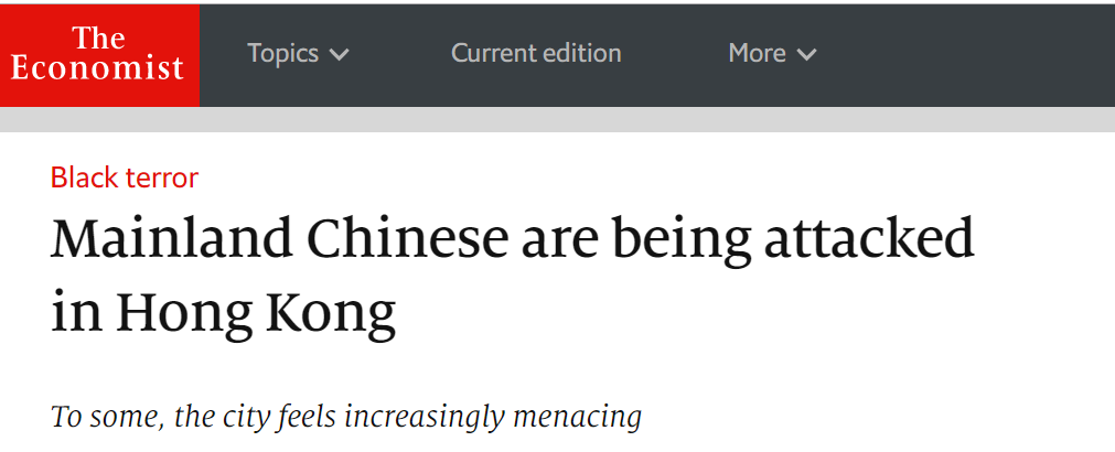 《经济学人》上周发布的一篇文章报道了内地人在香港遭到的暴力袭击,直接点出香港的现状就是“黑色恐怖”。文章十分具有预见性的是,在列举多个内地游客、在港工作者被攻击事件的同时,特别关注了在香港大学校园里的处于焦虑状态的内地学生。文章说,来自内地的学生面临着更大的风险,因为那些冲在骚乱前线的人非常可能就和他们坐在同一个课堂。结果,正如大家看到的,11月6日港科大就发生了内地学生遭本地学生会干事碰瓷,后被群殴至头破血流的事件。《经济学人》记者采访了一名在香港学习会计的21岁内地学生黄奇轩(音)。黄说,有一天他走在校园里,在给父亲打电话时,他的普通话被附近一名身穿黑衣的本地学生听到,结果这名学生就开始朝他大喊大叫。后来,这名本地生一路尾随他,一路继续用粤语喊着示威口号,幸好最后没有发生冲突。《经济学人》报道截图:《黑色恐怖 中国内地人在香港正被攻击:对一些人来说,这个城市越发险恶》