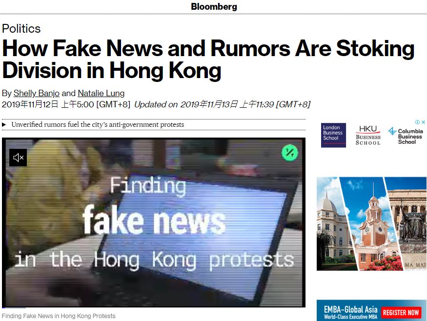 再如在8月31日太子站的冲突中,香港民调显示全市仍有一半的人认为在事件中有人被警察殴打致死,示威者口述的故事情节也被放大,最终导致数十个港铁站和铁路线遭到持续严重破坏,只能被迫提早关闭。文章引述了香港大学新闻及传媒研究中心一名研究了7年假新闻的专家说,假消息能自我强化,从而导致舆论趋向极端。文章总结说,随着香港反政府示威进入第23周,这座城市已被大量的网络谣言、假新闻、政治宣传所淹没,各种“极化”的言论助长了不信任和暴力,使香港的困境更难解决。“我担心,香港现时形势已发展到这样一个地步,那就是和解再无可能。”这名香港大学的专家对记者这么说。彭博社11月12日报道截图,视频标题为“发现香港示威中的假新闻”
