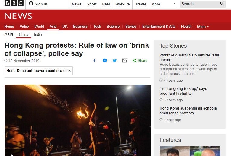 11月12日BBC的报道《香港示威:警方说,法治处于“崩溃的边缘”》
