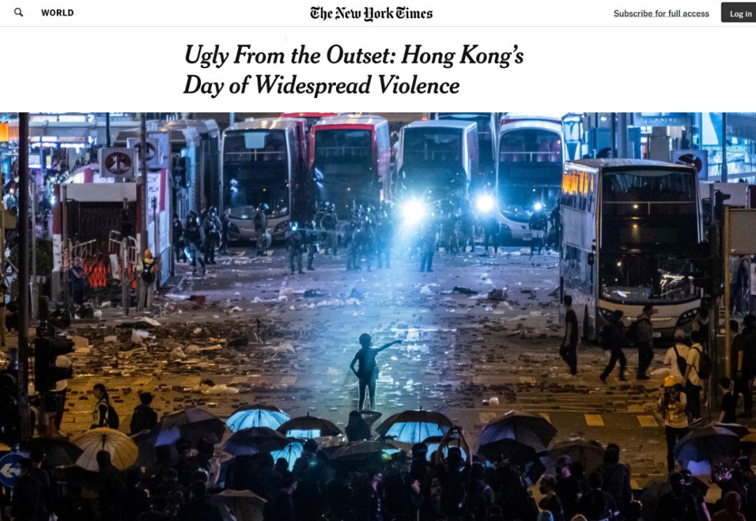 本周一,《纽约时报》发表了一篇题为《丑陋的开端:香港暴力蔓延的一天》的文章。文章一会用示威者的话说警方暴力,一会儿又列举出很多客观事实,来说明示威者的暴力。