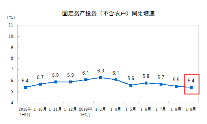 上图是过去一年全国固定资产投资增速走势。截至今年三季度末,投资增速只有5.4%,基本上是12个月的最低点。中国经济是靠投资拉动的。现在投资只增长了5.4%,而GDP三季度增速是6.0%。这种背离意味着,未来经济增速可能还会放慢。所以,要稳增长,首先要把投资拉上去。