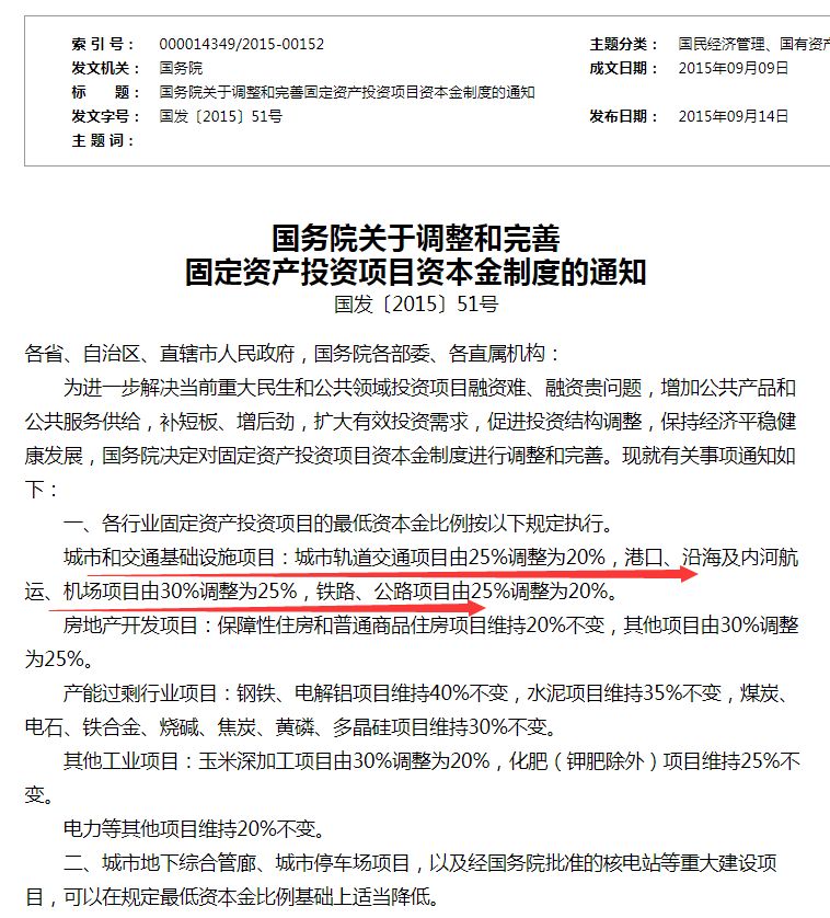 所谓“资本金比例”是指在股东以自有资产投资占总投资的比例。国家为了调控经济,会要求固定资产投资项目有一个最低比例,这项制度是1996年建立的。比如你要投资一条高速公路,总投资是5个亿,那么你的资金必须达到20%,也就是1个亿。这个20%,就是“最低资本金比例”。假如你的自有资金达不到“最低资本金比例”的要求,那么银行不会给你贷款,你也拿不下这个项目。“最低资本金比例”是国家宏观调控的重要手段。上次调整“最低资本金比例”是在2015年9月9日,也就是楼市去库存启动之前。当时经济也面临较大的下行压力,很多投资类别的“最低资本金比例”都调低了。