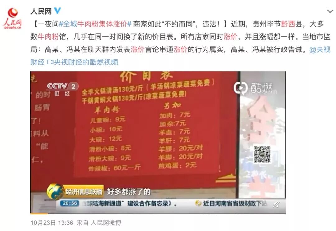 这也让人想起不久前,贵州毕节黔西县牛肉粉店集体涨价的新闻,事后被当地监管部分裁定违法并予以行政告诫。