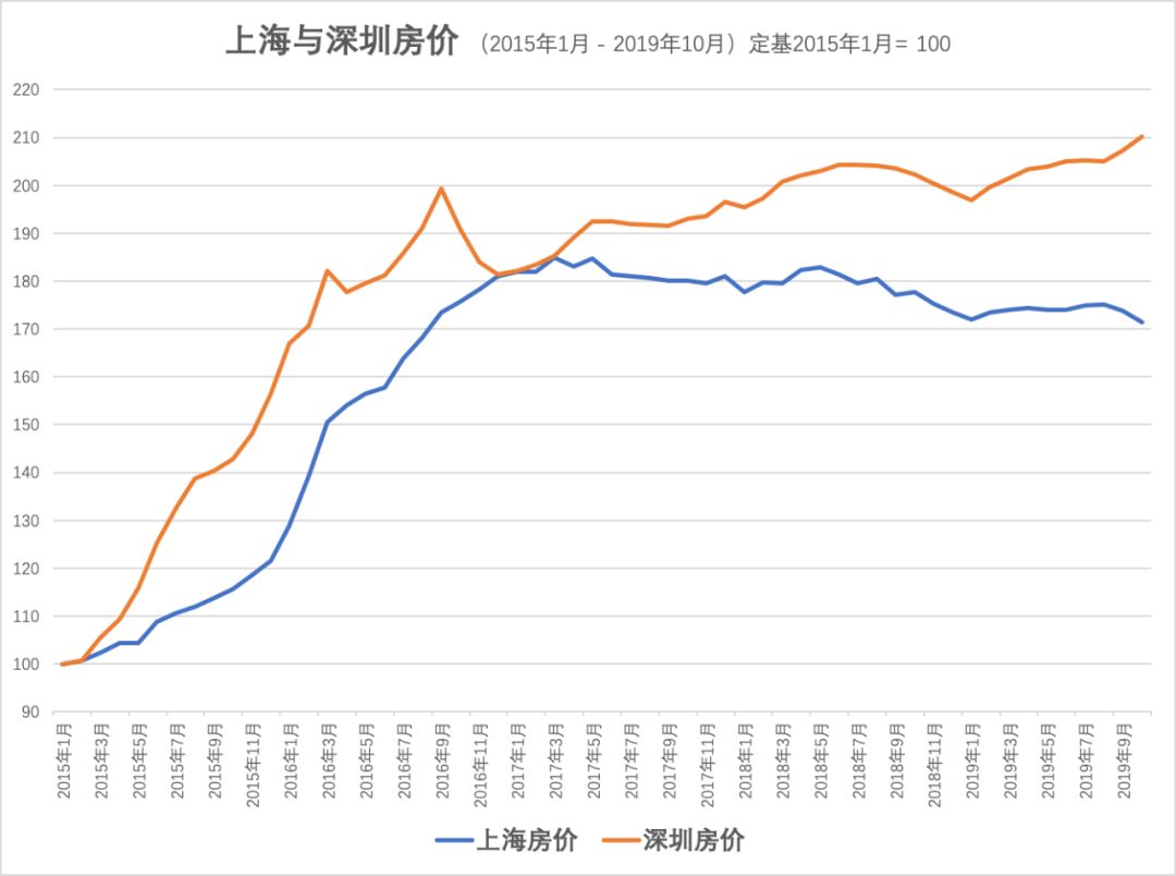 根据中原地产研究中心的数据,对比深圳和上海的房价走势,自2017年3月以来,深圳房价跑赢上海接近40个百分点。