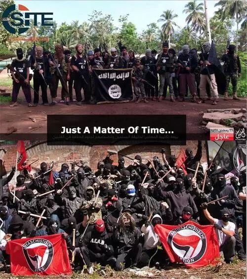 对了,还有曾经是“山巅之城”的美国,左翼组织ANTIFA,跟恐怖主义有啥差别?他们打着反法西斯的旗号,做的事跟法西斯一样恶劣,下面两张图是IS恐怖组织跟ANTIFA的对比,是不是很像?