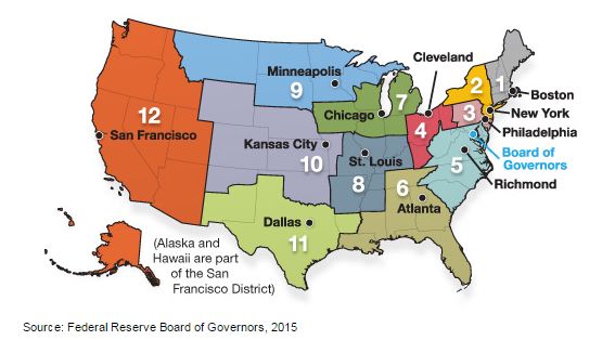 12家分布全美主要城市的地区性的联邦储备银行及辖区