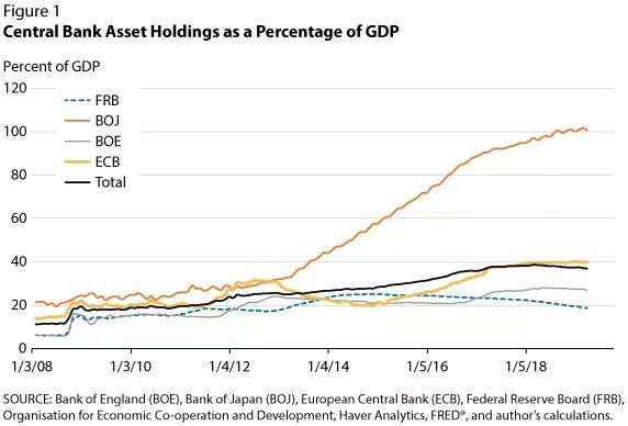 金融危机后,各个主要经济体央行的资产负债表都显著扩大,以央行资产/GDP来衡量QE的强度和节奏,美国可能还是最克制的一家:在2018年末,美联储资产/美国GDP已降至20%以下,英国的这一比例为40%,日本已经超过100%。如果量化宽松是“风险转嫁”的途径,那从数据看,美国显然没有占到便宜。