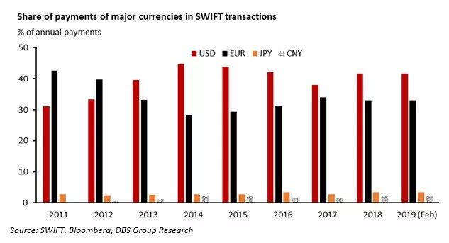 近年来美元、欧元、日元、人民币在全球支付市场中的比例(红色为美元)