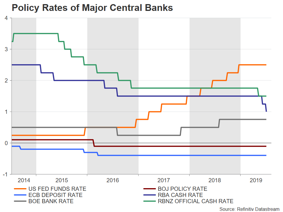 2018年后,美联储利率(图中橙色线)已显著高于日本央行、欧洲央行、英国央行、澳洲联储以及新西兰联储的利率