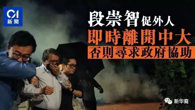 面对校园被“占领”的耻辱,一直支持暴力学生的港中大校长段崇智也感到了恐慌,被迫公开谴责蒙面黑衣人。段崇智校长昨日紧急发布谴责信敦促暴徒离开,否则校方将寻求相关政府部门协助。他表示,有为数过千的蒙面人士因应网上号召到中大,相信当中大部分并非中大学生,场面极度混乱,之后校园发生更多违法事件,校园遭受的大规模破坏。还说,所有进出大学的人士须向蒙面黑衣人展示身份证明,随身物品及电话亦遭搜查才可放行,是严重侵犯大学成员的出入自由,造成恐慌。