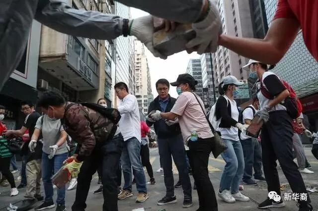 市民自发上街清理垃圾、路障。在暴徒比较集中的中环,不少上班族经过颓垣街道,忍不住停下脚步自发清理黑衣人留下的废墟,他们把街上的砖头翘起砸向警察,把垃圾桶、自行车堆到路中央设置路障,好好的路面被搞的一片狼藉。等到暴徒散去,有市民会自发聚集起来,有香港本地人也有外国人,默默把垃圾桶移到路边,把砖块嵌进坑里面去……