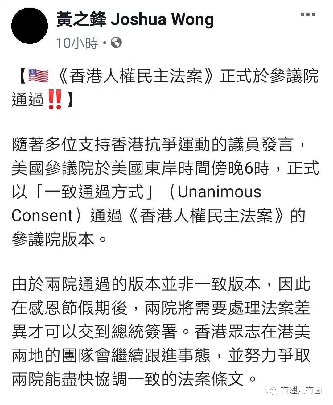 参议院通过法案的消息一经传出,以黄之锋为代表的乱港分子欢欣鼓舞,认为自己大获全胜,觉得《香港人权与民主法案》一定会给香港特区政府带来严重打击,自己抗争的目的终于取得阶段性胜利,开心得像个傻子……