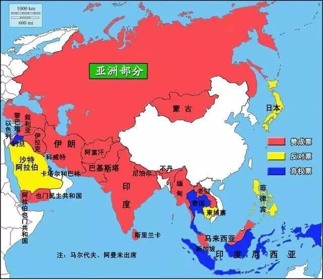 亚洲当时加入联合国的一共30国投票:赞成票19票,反对票4票,弃权票7票。日本、菲律宾,当时都是受美国控制,亲美反中立场毋庸置疑。沙特是美国在中东的核心盟友。柬埔寨当时是亲美政权。所以这四个国家都投了反对票。亚洲其他国家支持中国,主要是反对美国霸权主义的立场,本质上是中国得道多助的结果!