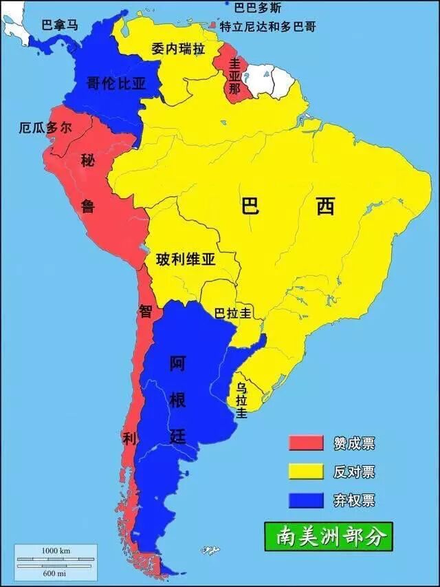南美洲当时加入联合国的一共13国投票:赞成票5票,反对票5票,弃权票3票。南美国家,没有经历两次世界大战,新中国建立前,大批华人到南美求生,在抗日战争期间,大批南美华侨对中国提供了大量的物资支持。新中国成立后,大批华侨对新中国缺乏了解认知,带有比较深的敌意,一定程度上影响了南美国家的立场。甚至在中国全面崛起之后,巴拉圭依然顽固的支持台湾。