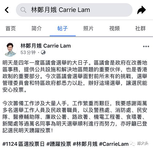 11月23日晚21时,特区政府行政长官首林郑月娥在FB发文,称区议会选举是香港政制的重要部分,而今届区选面对前所未有的挑战,选举管理委员会和特区政府都悉力以赴办好这场选举,呼吁已登记选民明天踊跃投票。林郑月娥表示,今次筹备区选的工作涉及大量人手,工作繁重而艰巨,她感谢两万多名选举工作人员及民政署职员,以及警务处、消防处、民安队、医疗辅助队、廉政公署、路政署、机电工程署、食环署、新闻处等过万名同事,为选举顺利进行而努力。根据统计,明天共有选民4,132,977人,较去年增加392,601人。与2015年区议会换届选举比较,本届区选新增43.9万名选民。