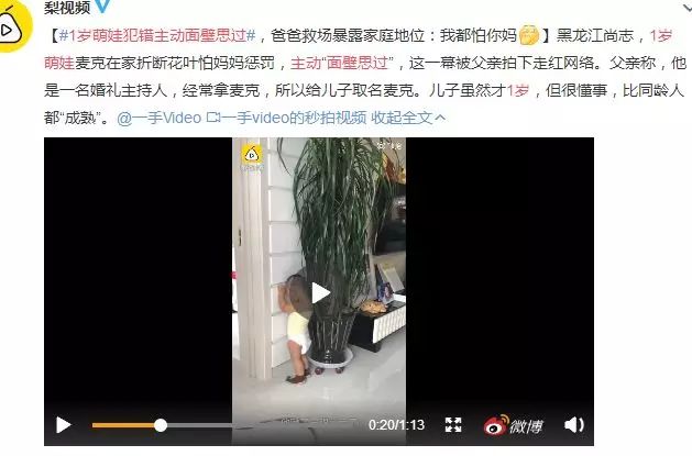 黑龙江的一个小男孩,因为折断了客厅的花叶,害怕被妈妈惩罚,主动面壁思过。