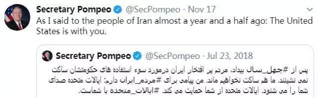 可能有人会问,美国和伊朗敌对情绪那么重,美国怎么支持呢?通过互联网等方式都可以提供支持,现代技术背景下,美国颠覆他国的能力和效率都提升了,原因就是社交媒体的出现提升了信息传播的效率,提升了颜色革命的组织能力。譬如,上述蓬佩奥网上对示威者的呼应。与此同时,美国一定有渠道在经济上支持伊朗国内的暴乱分子,就像支持香港暴乱分子一样。