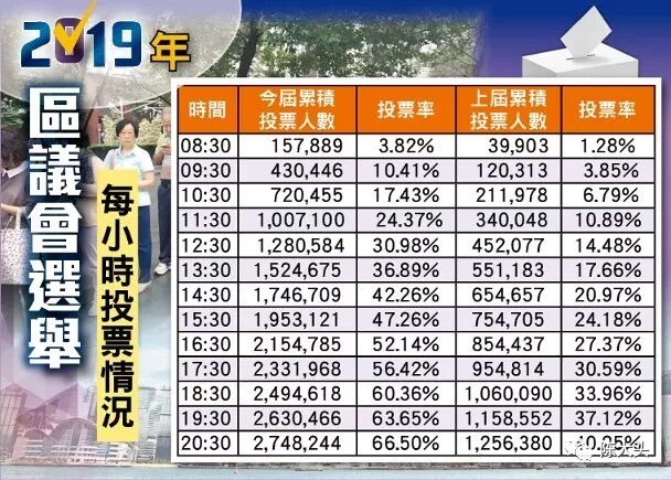 2、投票速度和投票率超过历届,打破香港回归以来所有选举的纪录。4、本次区议会选举是在暴力的阴霾下举行的,市民踊跃投票,用选票决定香港未来。本次共有选民4,132,977人,较去年增加392,601人。与2015年区议会换届选举比较,本届区选新增43.9万名选民。在早上7点半已有超过600个投票站顺利开始投票,仅两个投票站有轻微延误。投票时间为早晨7时半至晚上10时半,不少年轻人未等投票站开放,已早早于站外排队等候投票。上午8时半,行政长官林郑月娥到罗便臣道2号高主教书院投票,随后她对传媒表示,今次区议会选举正直社会动乱,面临很大挑战,但相信经各方努力,投票会和平有序。过去的几个月,由于暴乱事件,导致香港止暴制乱呼声越来越高,港人纷纷决心“以票止乱”。内地有数十万港人工作、学习和生活,连日来他们纷纷自掏腰包,坐飞机回港投票回港,拟投下自己神圣的一票。在黄大仙凤凰选区,一位百岁婆婆行出来撑建制派候选人,踊跃投票。住在天水围20多年的选民张先生表示,现时香港形势复杂,今次投票会支持建制派人士,希望社会和平、安定。艺人陈小春也在投票后也在微博贴文表示为香港投下止暴的一票。截至早上8时半,即投票首1小时,全港累计投票人数为157,889人,累计投票率为3.82%,比上届多3倍。 截至中午12时半,即投票开始后5小时,全港累计投票人数为1,280,584人,累计投票率为30.98%,比上届多1.8倍。截至下午16时半,即投票开始后9小时,全港累计投票人数为2,154,785人,累计投票率为52.14%,比上届多1.5倍。 截至下午18时半,即投票开始后11小时,全港累计投票人数为2,494,618人,累计投票率为60.36%,打破回归以来所有选举的记录。截至下午20时半,即投票开始后13小时,全港累计投票人数为2,748,244人,累计投票率66.50%。21时30分,全港累计投票人数为2,853,608人,累计投票率69.04%。