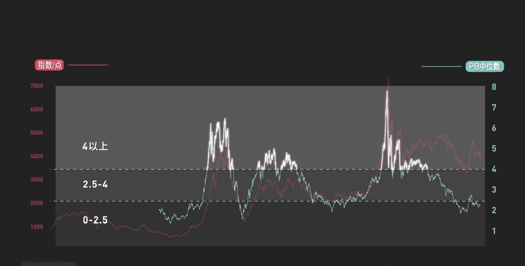 红色曲线,反映了A股全市场的走势;白色曲线,反映了指数的历史市净率走势。