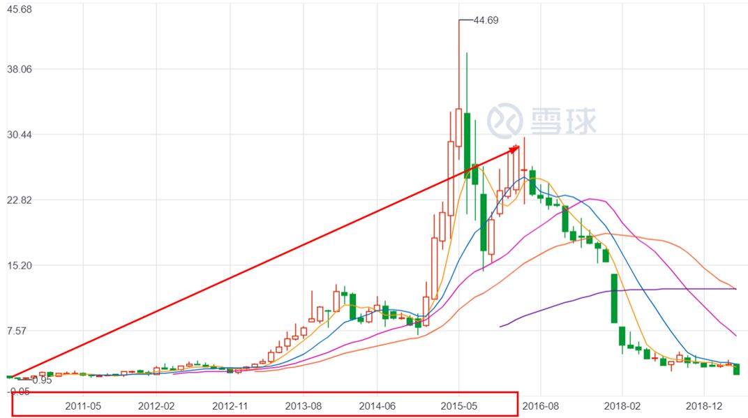 而它的股价也跟随业绩一路大涨,特别是2015年,股价最高翻了4倍: