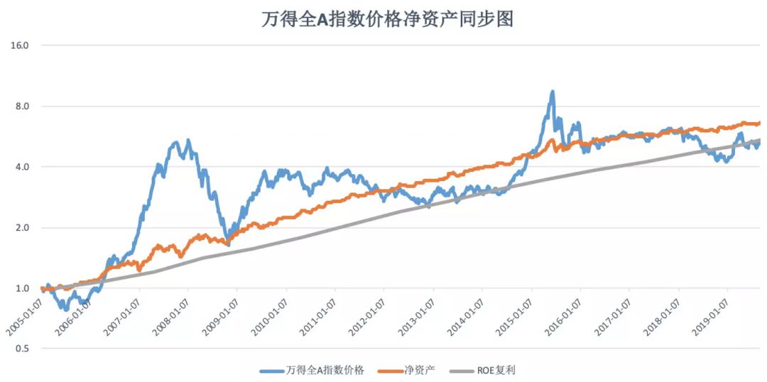 1)蓝线,是万得全A指数价格,代表了沪深两市全体股票的历史走势;