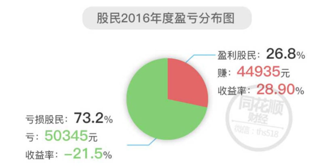 根据同花顺2016年的调查,当年亏损股民超过七成,盈利和不赚不亏的加起来不到三成。