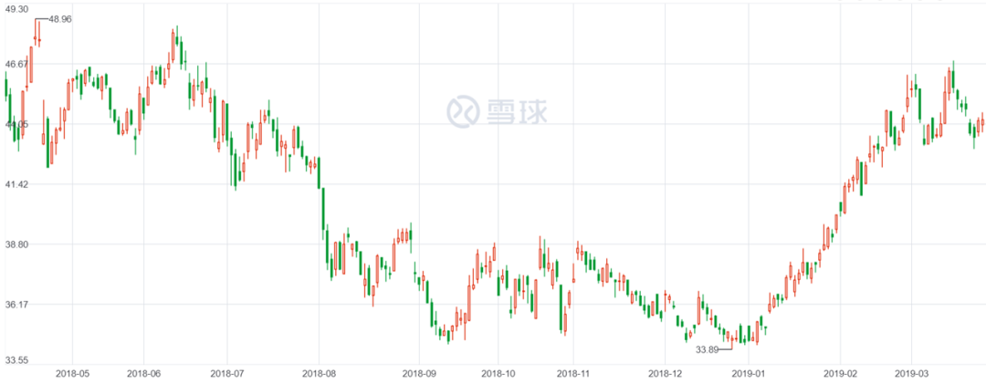 今年年初股市回暖,这只股票也开始慢慢上涨,到3月份又回到了45元附近。