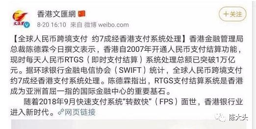 比如,全球人民币跨境支付的七成都是通过香港去处理。