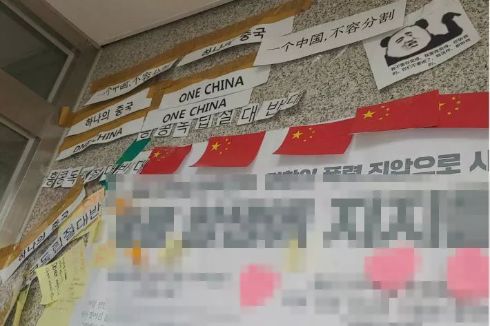在汉阳大学,中国留学生们看到乱港大字报后,用五星红旗和写有支持统一文字的便签把乱港大字报“包围起来”。