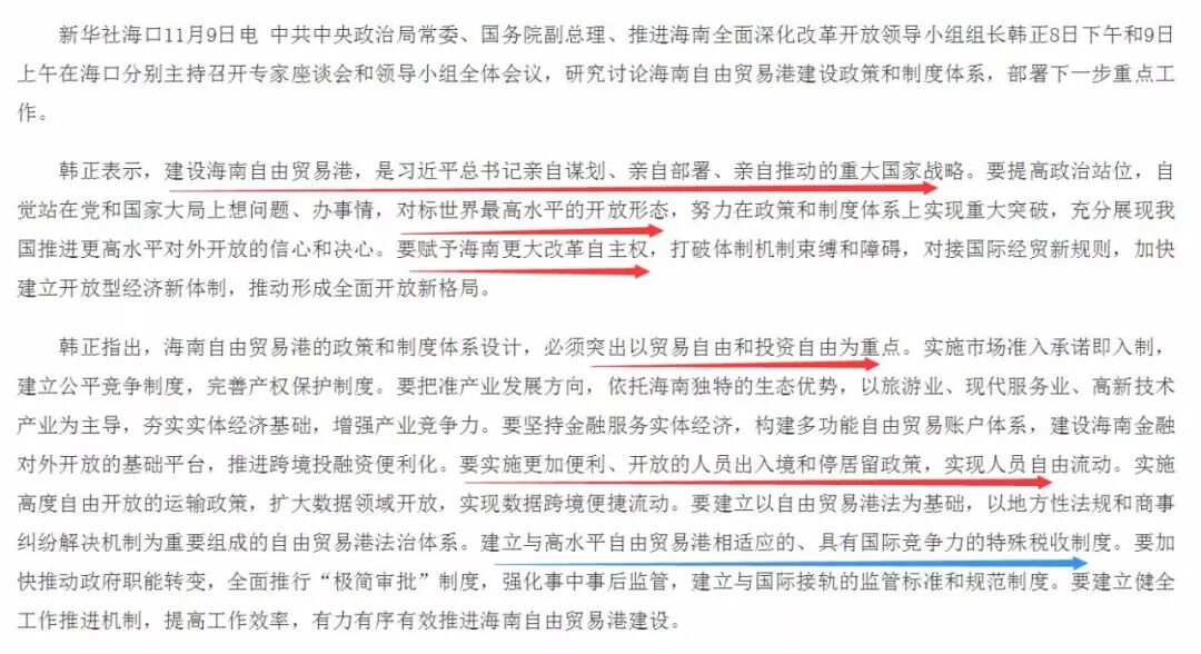2019年即将过去,2020年即将到来。展望新的一年,有三个地方最有悬念,其不动产价值最有望获得全面提升。也就是说,这三个区域都可能在2020年获得新的、重大发展机遇。自由贸易港,是“自由贸易试验区”的升级版。领导人在第二届“进博会”开幕式上讲话的原文是——“加快推进海南自由贸易港建设,就是我们的海南省,全省建成自由贸易港”。这个力度可谓“空前”。因为中国最大的“自贸试验区”在上海,扩容后也不过数百平方公里。中国最大的自由港是香港,总面积也才1100平方公里。而海南未来要建设的自由贸易港,陆地总面积达到了3.54万平方公里。上海的“临港自贸新片区”,事实上在试行“自由港”的政策,但仍然存在“物理分割线”。而海南则采用了香港的模式,把全境都装入了“自由港”。除了存在跟外部的边界外,内部没有边界。另外,海南自由港很有可能实施“零关税”,这个力度也是空前的。2019年10月25日,由中国特色自由贸易港研究院、中国(海南)改革发展研究院、国务院参事室自贸试验区建设研究中心、海南省委政策研究室等单位联合主办的一个官方论坛在海口举行,会上中国(海南)改革发展研究院院长迟福林建议,要尽快在海南全面实施零关税。迟福林还建议:一是对医疗健康、文化娱乐、旅游、教育、科技研发、会展等服务业行业发展所需原材料、基础设施配套的用品设备的进口实施“零关税”,并免除进口环节增值税;二是对事关民生的重点行业实施“零关税”。11月初,副总理韩正考察海南并举行座谈会,下面是新华社播发的通稿的截屏。