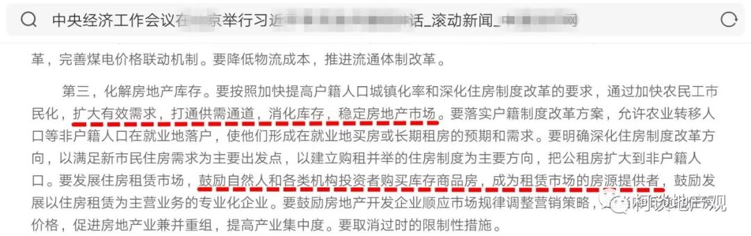 2015年12月21日,经济工作会议原文中明确:“鼓励自然人和各类机构投资者购买库存商品房,成为租赁市场的房源提供者”、“扩大有效需求,打通供需通道,消化库存,稳定房地产市场”。