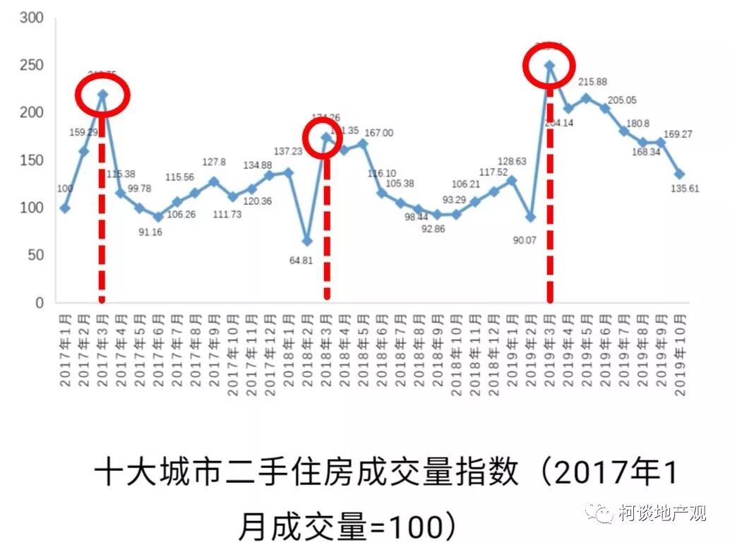 图表中可以清晰的看出,2017-2019这三年这10座城市二手房的最大成交量毫无悬念的全都是出现在3月份。这就是典型的小阳春行情,不管牛市熊市,从未改变、从不缺席。