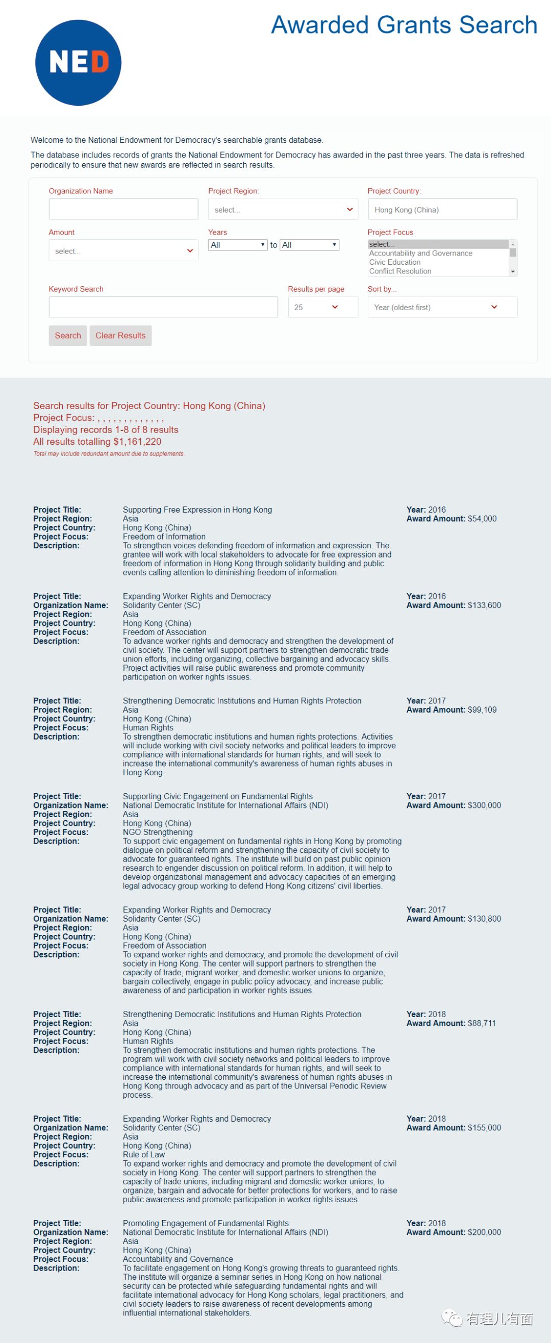 (NED官方网站公开的其近年向香港输送的资金数额)