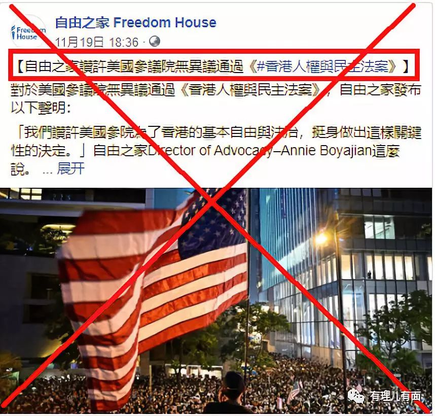 本次香港修例风波,自由之家除了幕后资助纵乱,还多次公开声援美国干预香港事务、煽动暴力乱港!10月2日,自由之家通过其脸书专页发帖蔑称“中华人民共和国成立七十周年标志着其晦暗的时刻”;11月19日,自由之家再次在脸书上赞许美国参议院无异议通过《香港人权与民主法案》,反中乱港不遗余力!
