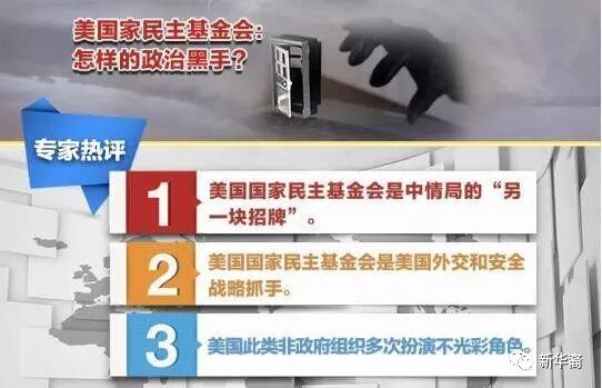 其中的美国国家民主基金会(The National Endowment for Democracy,缩写为NED)是美国非政府组织中的“龙头老大”,属于具有政府背景的非政府组织,地位相当特殊。据媒体报道,该基金会被认为与美国中央情报局存在密切联系,是美国对外“民主”渗透活动的重要机构,成立于1983年,是主要依靠美国政府拨款从事活动的所谓非政府组织。