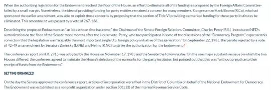 次年,美国国会通过《国务院授权法》,拨款3130万美元成立“美国国家民主基金会”,并给予其免税待遇。