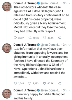 然而,这一起普通审判,却遭到了美国总统特朗普的直接干预。他多次在推特上力挺他眼中的“战斗英雄”。不仅将加拉格转移到限制级别较低的场所关押,还恢复了他被军事法庭降职的军衔。