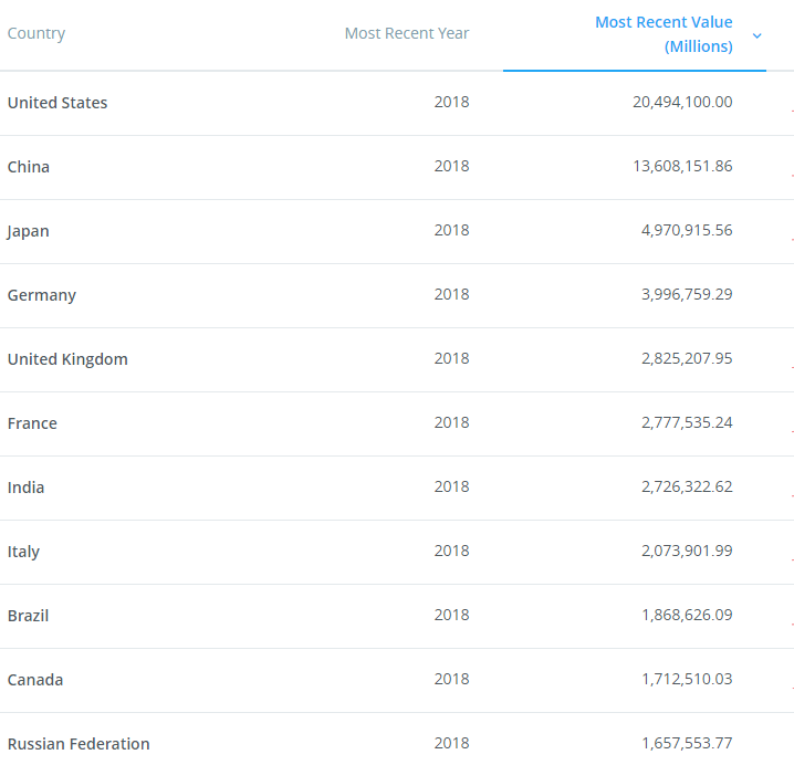 要知道根据世界银行最新数据,2018年各国GDP超过1.7万亿美元的国家也仅有10个。连普京大帝的俄罗斯联邦一年的GDP也都不足1.7万亿美元。