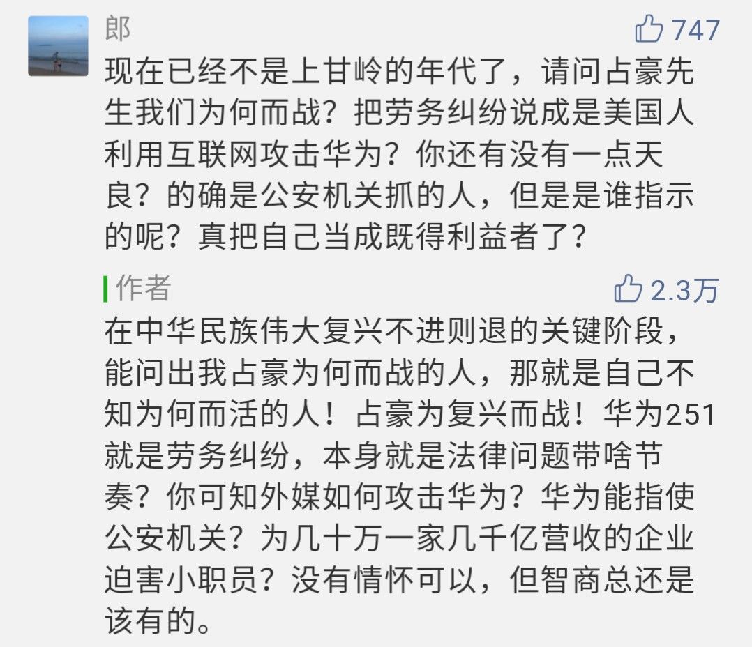 在中华民族伟大复兴不进则退的关键阶段,能问出我占豪为何而战的人,那就是自己不知为何而活的人!占豪为复兴而战!华为251就是劳务纠纷,本身就是法律问题带啥节奏?你可知外媒如何攻击华为?华为能指使公安机关?为几十万一家几千亿营收的企业迫害小职员?没有情怀可以,但智商总还是该有的。