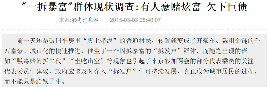 模式3的害处不仅如此,假设村里一个努力学习最终有机会到大城市求学深造的孩子发现凭自己的收入定居无望,而贪玩能混的同村同龄人却留在村里靠拆迁款住上了别墅。这对努力者会产生巨大打击,暴富者也会因为自己的经历成为“读书无用论”等反智主义论调的传播者。
