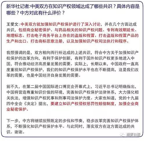 据人民日报,商务部副部长兼国际贸易谈判副代表王受文表示,协议相关内容的落实,将有助于强化知识产权保护,改善营商环境,扩大市场准入,更好维护包括外国企业在内的各类企业在华合法权益。